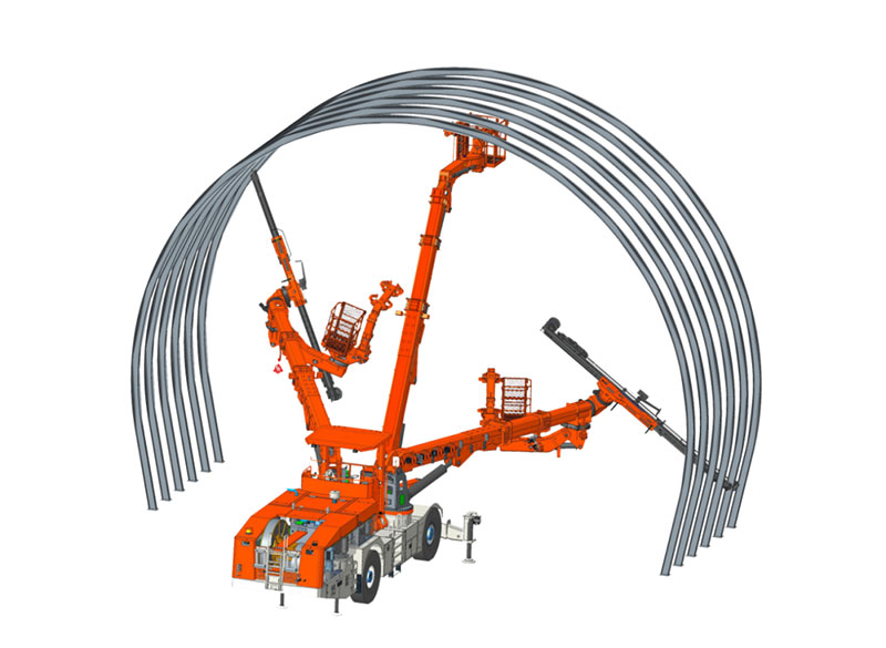 雙鑿巖拱錨臺車融合拱架施工與錨桿施工為一體,適應(yīng)各種規(guī)格鋼拱架安裝、錨桿施工、輔助裝藥平臺、輔助撬毛和通風(fēng)管作業(yè)等多功能,滿足在鐵路、公路隧道內(nèi)安裝單榀/多榀鋼拱架的規(guī)范性及安全性要求,滿足單洞單線、雙線、三線單次開挖(全斷面、臺階法)一次性鋼拱架安裝距離要求。