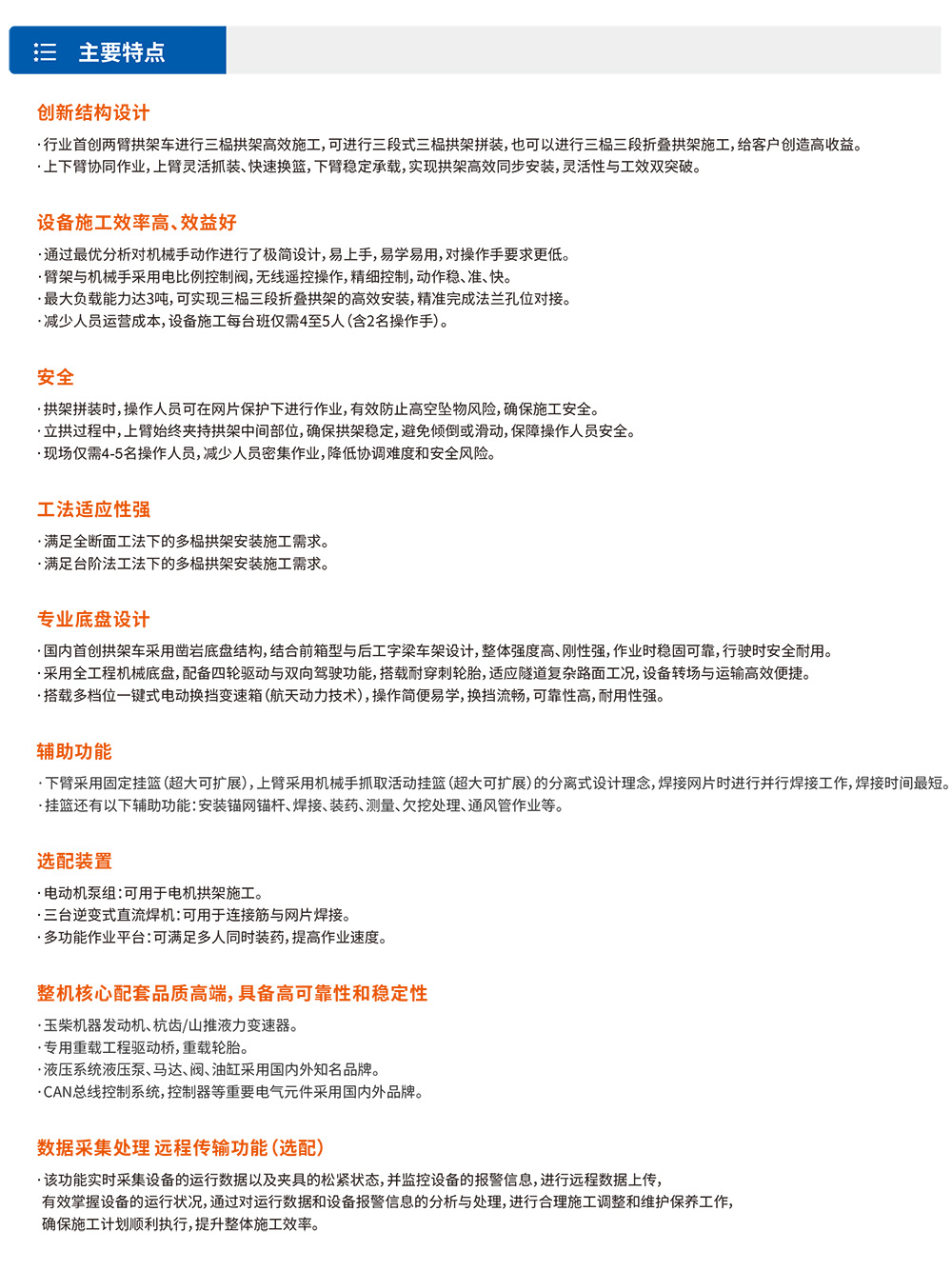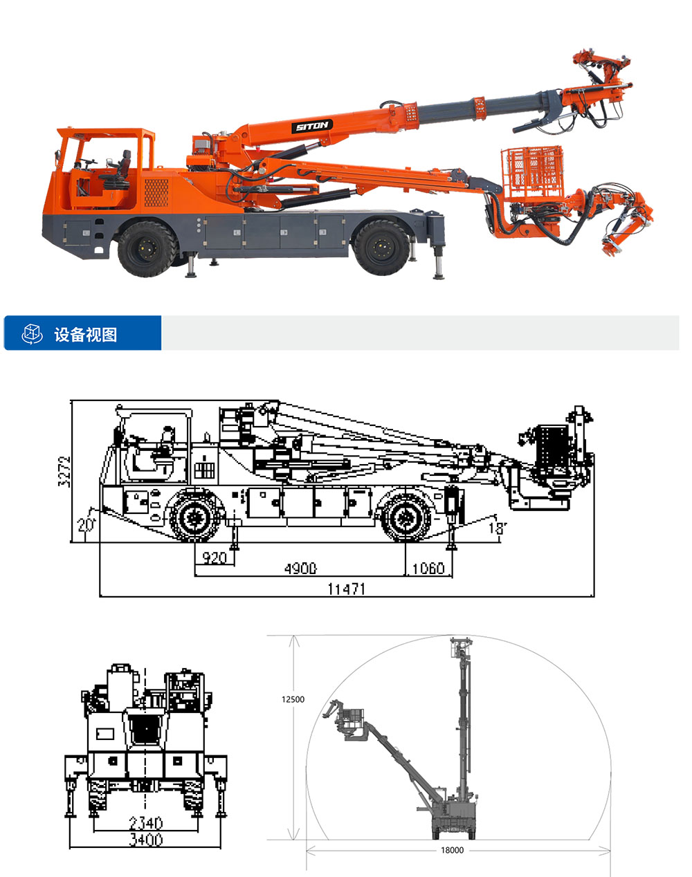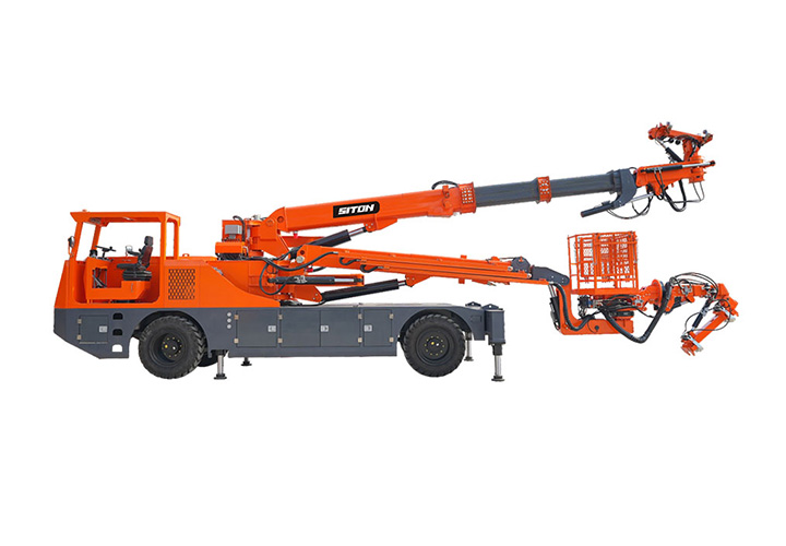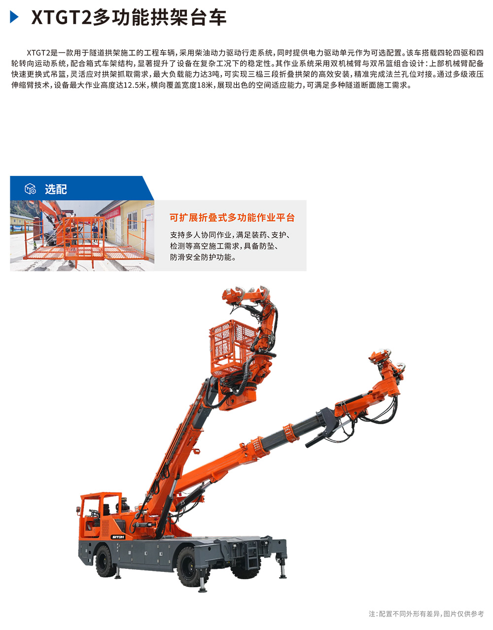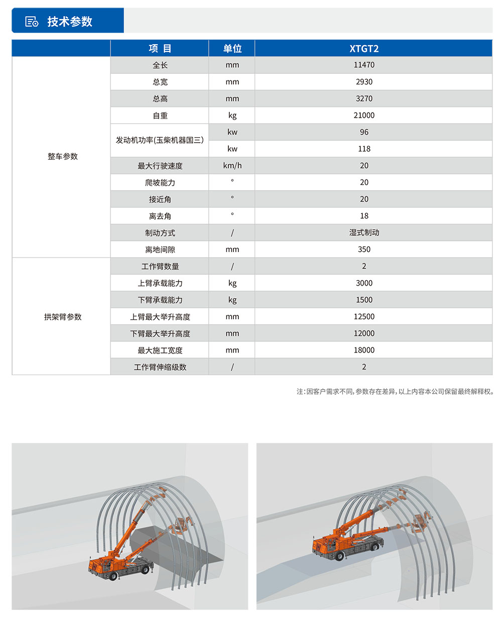XTGT2是?款?于隧道拱架施?的?程?輛,采?柴油動?驅(qū)動??系統(tǒng),同時提供電?驅(qū)動單元作為可選配置。該?搭載四輪四驅(qū)和四輪轉(zhuǎn)向運動系統(tǒng),配合箱式?架結(jié)構(gòu),顯著提升了設(shè)備在復(fù)雜?況下的穩(wěn)定性。其作業(yè)系統(tǒng)采?雙機械臂與雙吊籃組合設(shè)計:上部機械臂配備快速更換式吊籃,靈活應(yīng)對拱架抓取需求,最?負載能?達3噸,可實現(xiàn)三榀三段折疊拱架的?效安裝,精準(zhǔn)完成法蘭孔位對接。通過多級液壓伸縮臂技術(shù),設(shè)備最?作業(yè)?度達12.5?,橫向覆蓋寬度18?,展現(xiàn)出?的空間適應(yīng)能?,可滿?多種隧道斷?施?需求。
